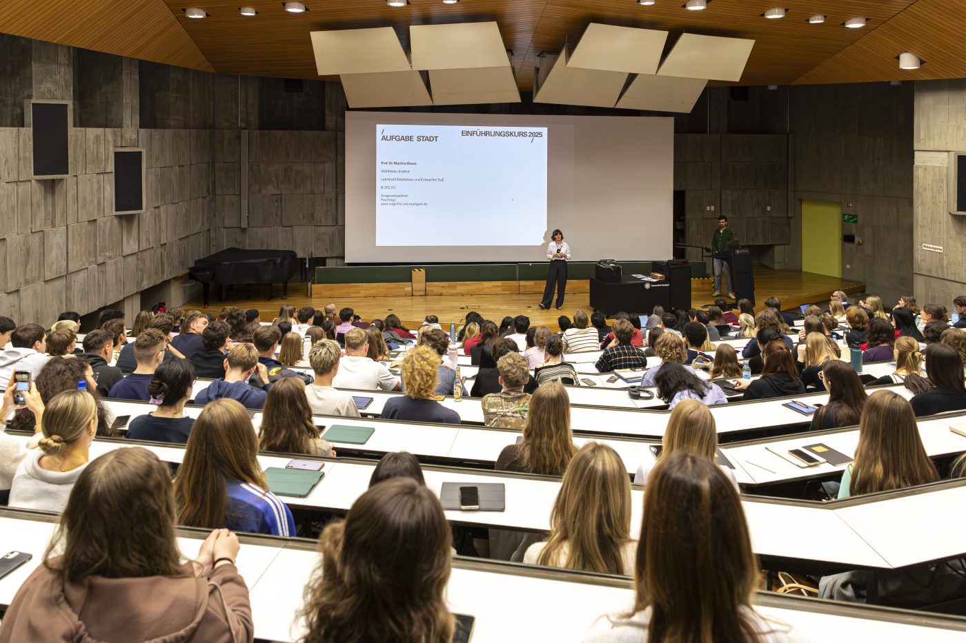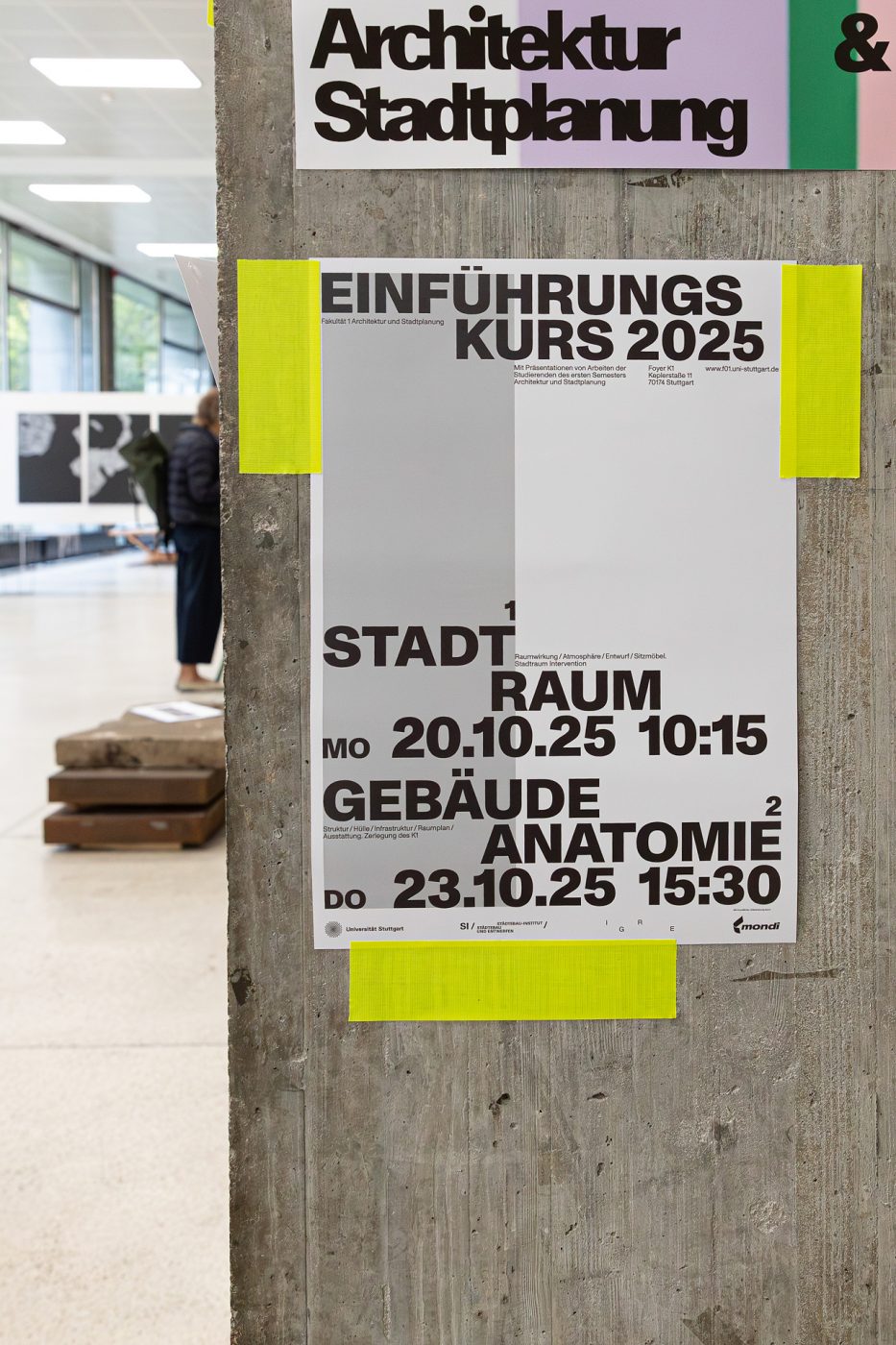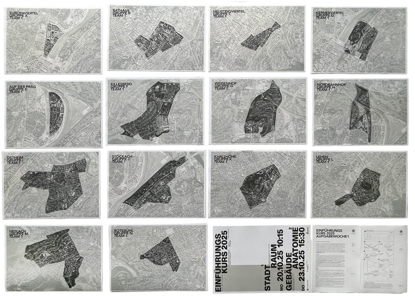 Der für die neuen Bachelorstudierenden konzipierte Einführungskurs setzt in der ersten Woche des Wintersemesters einen thematischen Schwerpunkt auf räumliche Fragestellungen, die auf unterschiedliche Maßstabsebenen Bezüge herstellen. Zu diesem Zweck erlernen die Studierenden eine maßstabsübergreifende Perspektive auf den Stadtraum Stuttgarts, unter Zuhilfenahme des Begriffs des Städtebaus einzunehmen. Darüber hinaus werden sie dazu angeleitet, erste Interventionen im Stadtraum zu verorten und zu testen.