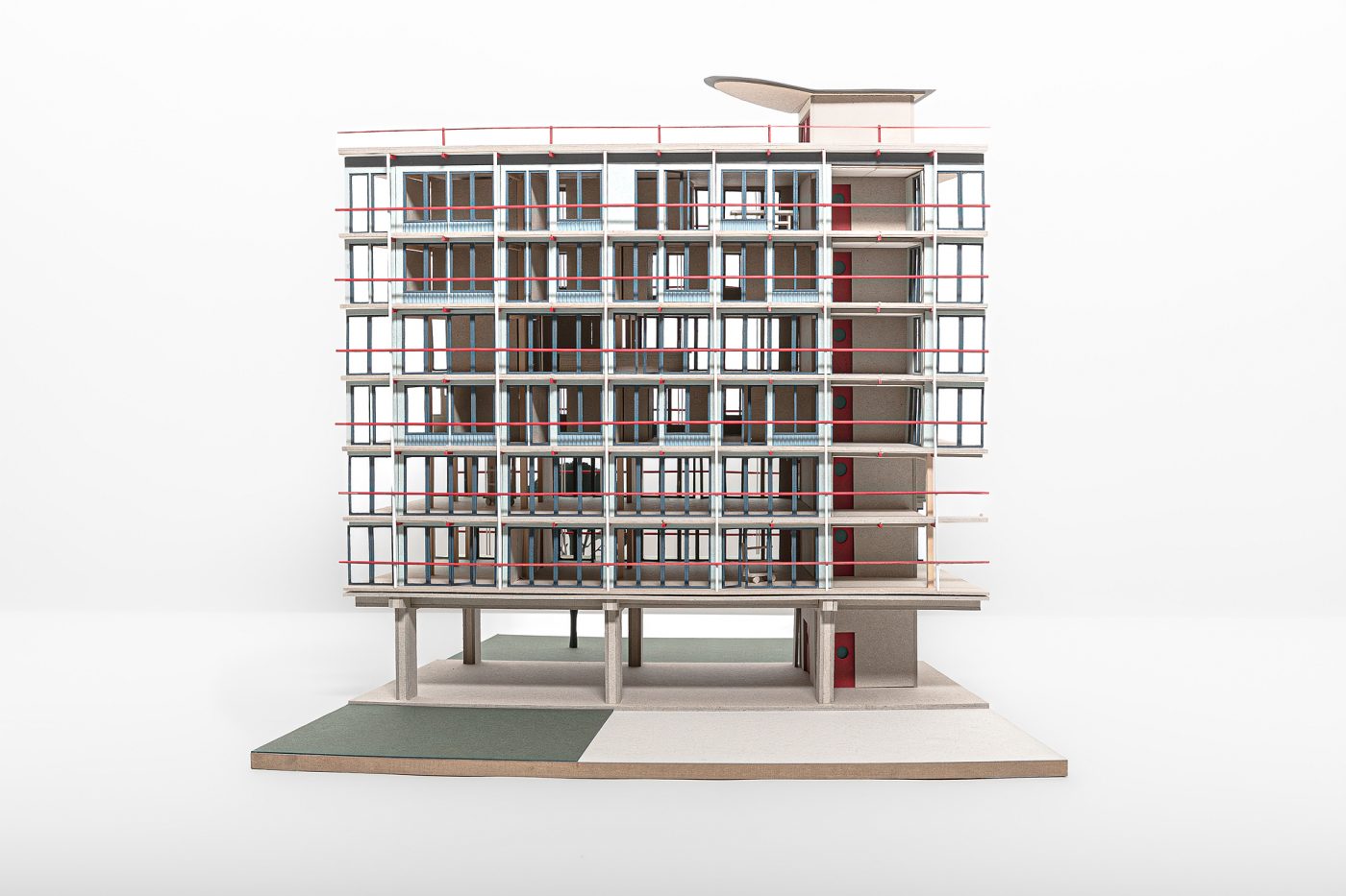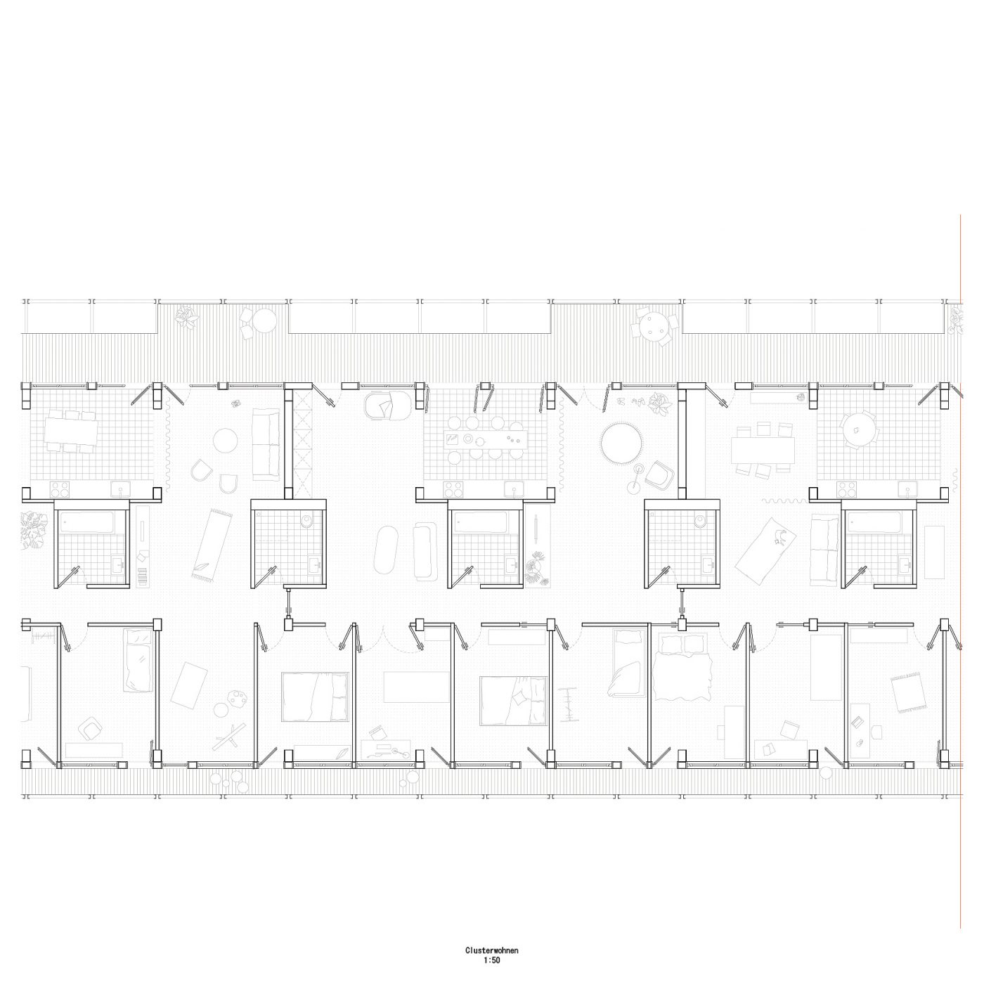 dauerhaften Wohnformen verbindet. Die Ferienwohnungen können wie Strandkabinen auf einen Kern komprimiert werden und die übrigen Flächen den Nachbarwohnungen zugeschlagen werden.Die Struktur ermöglicht vielfältige Wohnformen, die sich in Sequenzen als Nachbarschaften