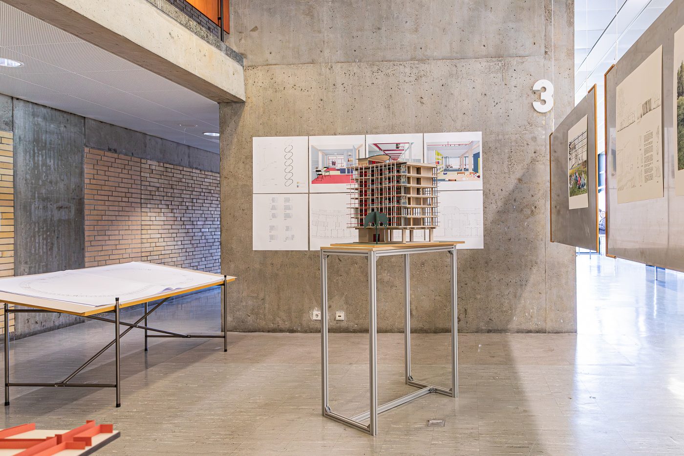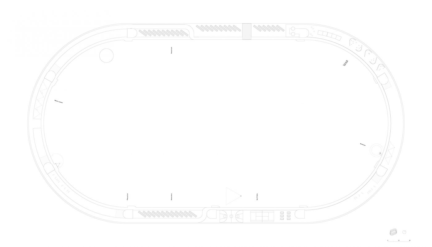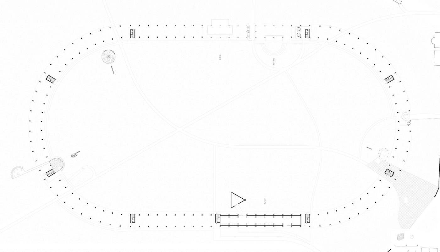 fassen lassen. Die Großform der Wohnbebauung folgt der Spur der ehemaligen Trabrennbahn und schafft ein Gegenüber zur denkmalgeschützten Tribüne mit Bühnenraum. Weitere öffentliche und kulturelle Inseln in der Großstruktur bereichern das Gebäude mit Nutzungs-angeboten für die