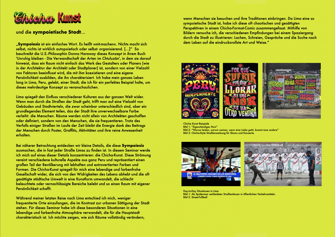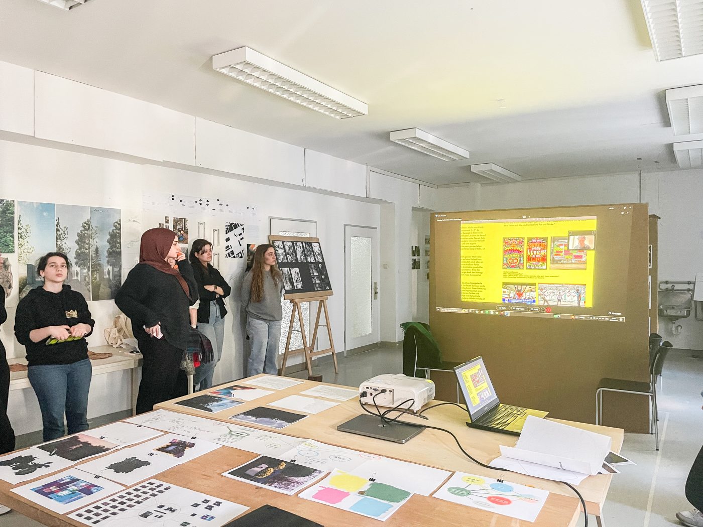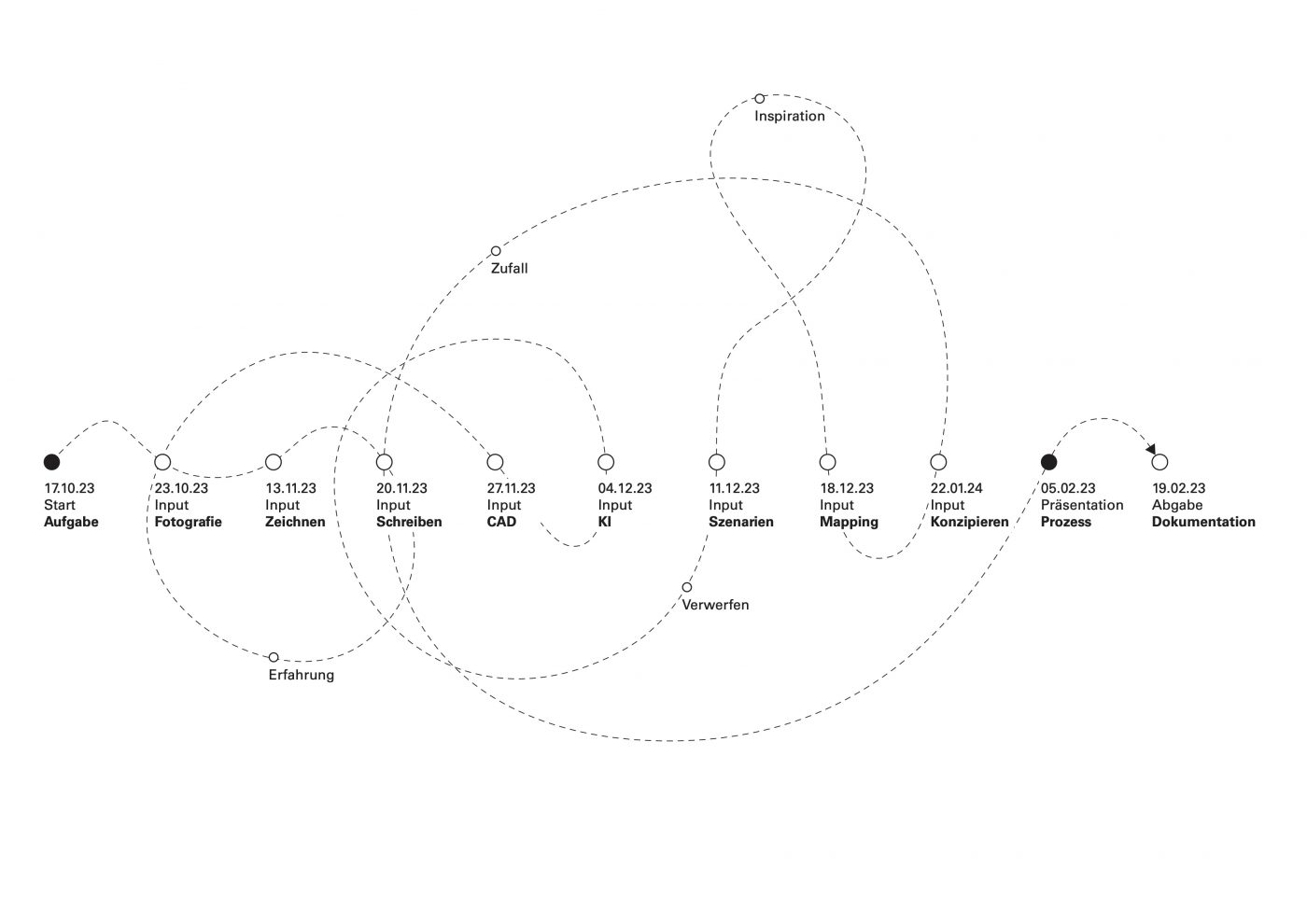 Daher suchten wir im Seminar die Auseinandersetzung sowohl in theoretischer als auch in praktischer Form, um die Phänomene und Herausforderungen der gebauten Umwelt entwerfend zu diskutieren: Vom Festhalten der Atmosphären eines Ortes über entwerfendes Forschen und Analysieren, die Anwendung der Szenariotechnik bis hin zur präzisen Darstellung eines Entwurfskonzepts. Wir setzten uns mit Raumwahrnehmung, Mapping, Modellbau und Grafik auseinander und untersuchten zudem neue Möglichkeiten, die uns sowohl durch KI als auch durch handwerkliche Techniken eröffnet wurden. Kurze theoretische Inputs des Lehrteams und weiterer Entwerfer*innen, die wir besuchten, konnten direkt im Anschluss praktisch umgesetzt und getestet werden. Im Mittelpunkt stand stets das Schärfen der Darstellungsweise sowie die präzise Kommunikation der Inhalte. Das Seminar vermittelte das Entwerfen als handwerklichen Prozess und rüstete die Studierenden mit Werkzeugen aus, die sie für zukünftige Entwurfsaufgaben einsetzen konnten.