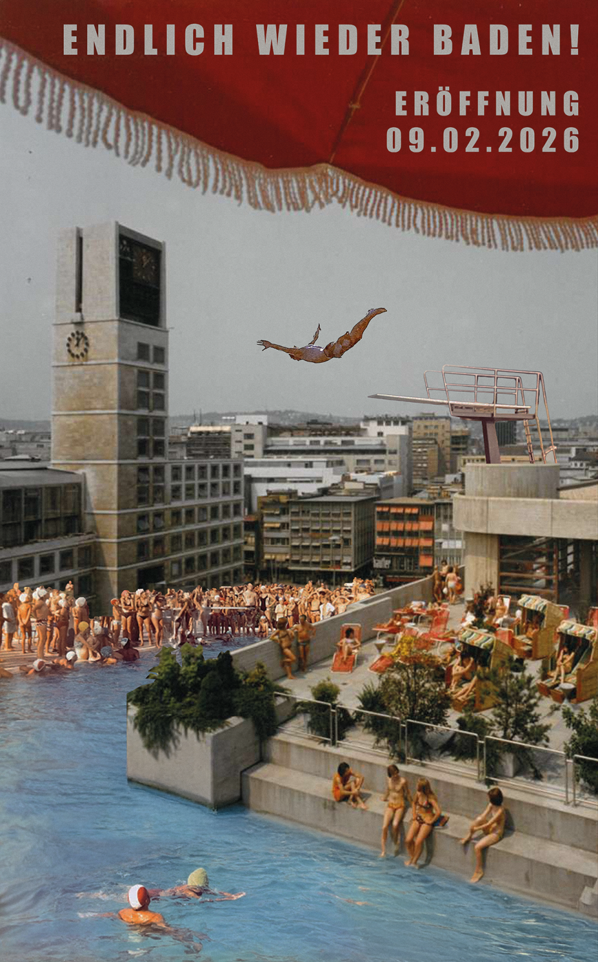 Im ehemaligen U-Bahn-Abgang, dem räumlichen Kern des Schwabenzentrums, entwerfen wir eine Badeutopie, eine Collage von Pamukkale. Die ehemaligen Fassadenplatten des sich im Abriss befindenden Gebäudes werden gestapelt und formen begehbare Beckenlandschaften, gespeist von der Breuninger-Quelle. Die notwendige Wärme liefert ein neu organisierter Rechenzentrumsbetrieb. Bislang dezentral arbeitende Serverstrukturen der Landesverwaltung werden vor Ort gebündelt. Ihre Abwärme temperiert die Badebecken und beheizt das Gebäude. Mineralquelle und Serverinfrastruktur verschränken sich zu einem hybriden System, in dem Datenströme und Wasseradern produktiv zusammenwirken. Parallel entsteht eine zweite soziale Infrastruktur: gemeinschaftliches Kochen, in der Lebensmittelrettung, Energieproduktion und Zubereitung ineinandergreifen.