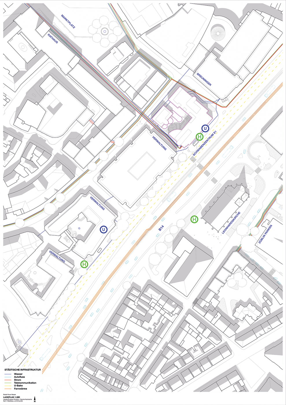Als politisches, wirtschaftliches, kulturelles und soziales Zentrum ist Stuttgarts Mitte Imageträger von Stadt, Land und Region. In den letzten Jahren wurden vermehrt neue Setzungen und punktuelle Aufwertungsmaßnahmen verschiedener Randlagen der Innenstadt in den Fokus gedrängt. Diese Bereiche zwischen historischer Mitte und autogerechter Stadt sind stark in die Jahre gekommen. Sie sind geprägt von nüchternen Zweckbauten der Nachkriegszeit, vielfach dominiert von den Bedürfnissen des Verkehrs mit unbefriedigenden öffentlichen Räumen und mindergenutzten Hinterhofsituationen. Mehrere tausend Quadratmeter Verkaufsfläche und ein beginnender Veränderungsdruck werfen die Frage nach der zukünftigen Rolle dieser Stadtquartiere auf! Wie sollen sich die Stadträume und das Stadtbild verändern? Wie sieht die urbane Mischung aus? Das Entwurfsstudio versuchte, durch analytische, phänomenologische und innovative Beiträge neue Impulse für die lokale Debatte über die Zukunft der Stadt zu bieten.