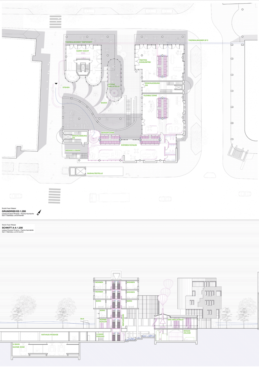 Feuer und Wasser gehören zu den vier Grundelementen. In der griechischen Philosophie stehen sie für die Grundordnung der Welt. Sie sind erhaben, monströs, polyvalent und beschreiben Notwendigkeit und Sehnsuchtsort zugleich. Indem die Elemente vor allem unsere taktile Wahrnehmung stimulieren, verbinden sie Körper und Welt und schaffen räumliche Atmosphären. Feuer und Wasser, Erde und Luft sind dialektisch, es ist unmöglich das eine ohne das andere zu diskutieren. Das von ihnen ausgehende Wohlbefinden wie das Unbehagen sind gleichsam Präsent. Die Elemente beziehen sich auf die Zustände fest, flüssig, gasförmig und energetisch, die durch Temperaturänderungen ineinander übergehen können. In der Architektur und im Städtebau beschreibt die Wiederentdeckung der Elemente die Suche nach einer anderen Verbindung zu Natur und Mitwelt. Das Aufeinandertreffen mit Feuer und Wasser erfordert ein Überdenken räumlicher Beziehungen, thermischer Kontrolle und sich saisonal verändernden klimatischen Bedingungen. Zudem stellt es Fragen an die städtische Infrastruktur. Auch die soziokulturellen Dimensionen der Elemente und ihrer Eigenschaft Momente der Intimität ebenso wie die des niederschwelligen Zusammenkommens zu gestalten scheint, mit Blick auf derzeitige Multikrisen, von besonderer Bedeutung. Diesen vielfältigen Aspekten von Feuer und Wasser sind wir im Studio nachgegangen. In Anlehnung an das Konzept „Täglich“ haben die Studierenden öffentliche Architekturen des Feuers und des Wassers an eigenständig identifizierten Orten der Stadt Stuttgart entworfen. Dabei wurden verschiedene Spuren und Geschichten des Feuers und des Wassers in Stuttgart aufgedeckt und im Entwurf kritisch weitergesponnen. Besonders deutlich wurde das maßstabsübergreifende Potenzial der Elemente zwischen körperlicher Erfahrung und städtischer Infrastruktur.