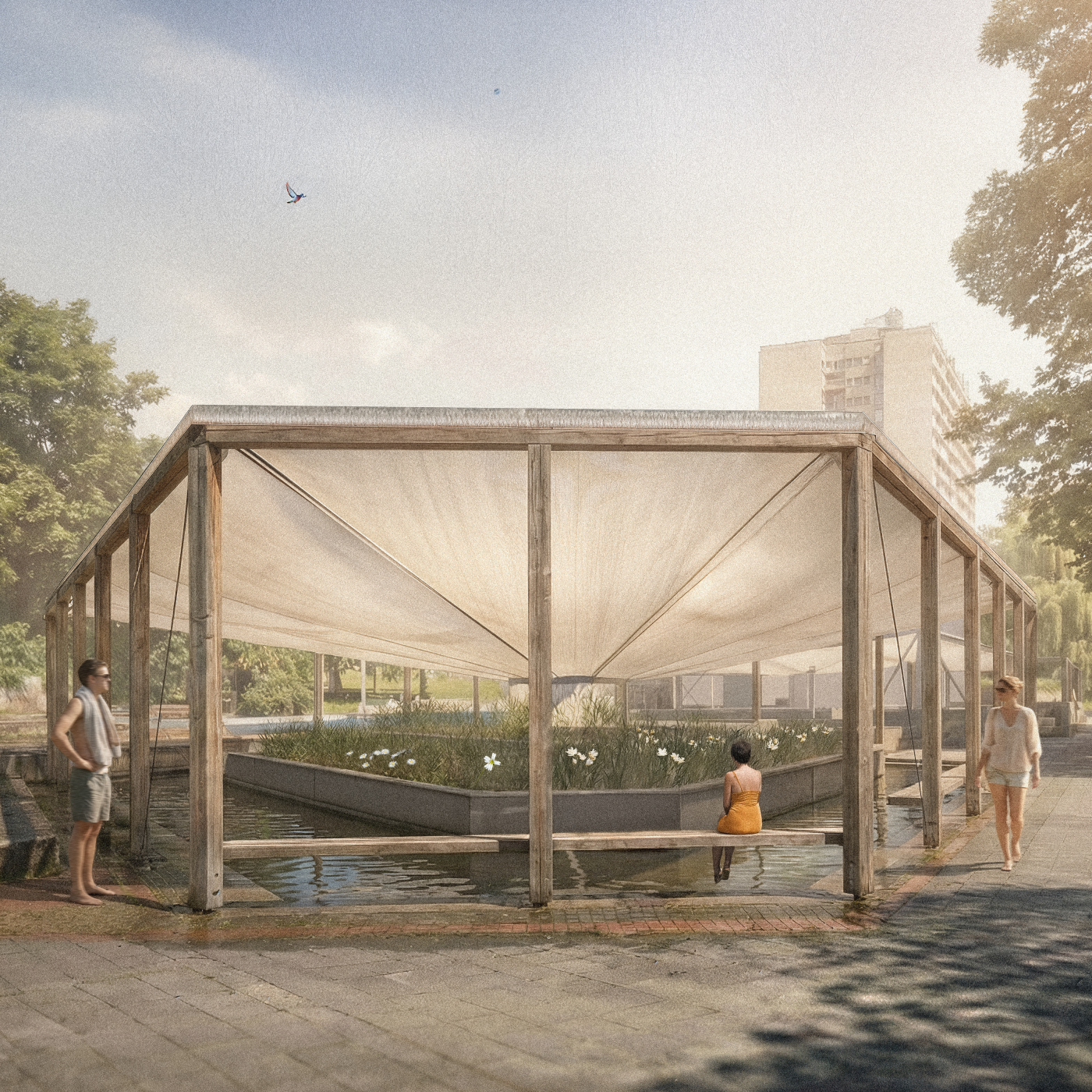 In unserem Entwurf setzten wir uns mit dem Thema der Intimität im öffentlichen Raum anhand des Badens und des Waschens in der Stadt Stuttgart auseinander. Indem wir Formen von Privatheit bewusst in den öffentlichen Raum übertragen, möchten wir einen Ort schaffen, der Nähe ermöglicht und soziale Verbindungen stärkt, anstatt Isolation und Ausschlüsse zu reproduzieren. Das Textil, in Form der architektonischen Elemente des Dachs und der Wand, schafft räumliche Momente zwischen Verhüllen und Verbergen. Als Ort diente uns die Brunnenanlage im Stadtgarten nahe der Universität Stuttgart. Dieses Denkmal wird seit längerem nicht mehr mit Wasser bespielt. Mittels Strategien des Sammelns und Klärens von (Regen-)Wasser, wollen wir die Brunnenanlage wiederbeleben und in einen lebendigen Ort sozialer Begegnung transformieren.